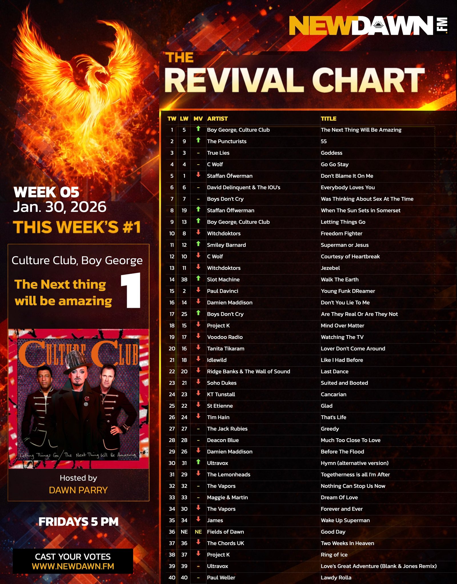 WELCOME TO THE OFFICIAL NEW DAWN RADIO TOP 40 REVIVAL CHART! Discover the ultimate platform for your favourite seasoned artists in the music industry with The Revival Chart. At New Dawn Radio, we celebrate those with over 20 years of releasing music and who continue to create fresh, exciting NEW music, even if mainstream radio often exclude them. How It Works: •Eligibility: Artists qualify if they or their band member/s have 20 years since their first song release under their belt. Their songs will debut on Dawn Parry’s daily Breakfast Show and on the Red Carpet Show 4pm, the hour before the Revival Chart Show every Sunday 5pm UK time. •Voting: Tracks with the most airplay over 7 days enter the Hot 50 Voting Pool. You then vote for your favourite songs/artists each week via the New Dawn Radio website. Listeners can vote for as many artists/songs as they like, but they can only vote only once per week. The votes are counted up each Friday, resulting in the Revival Chart positions. •Chart Updates: New releases have 4 weeks to hit the Top 40, or they’re removed from the pool. Every Sunday at 5 PM UK time, the Top 40 is unveiled on the Official Revival Chart Show on NewDawn.FM. Want to preview the tracks? Explore our curated playlist on Spotify for a taster of the best in the very latest new Revival music from your favourite Revival artists.
