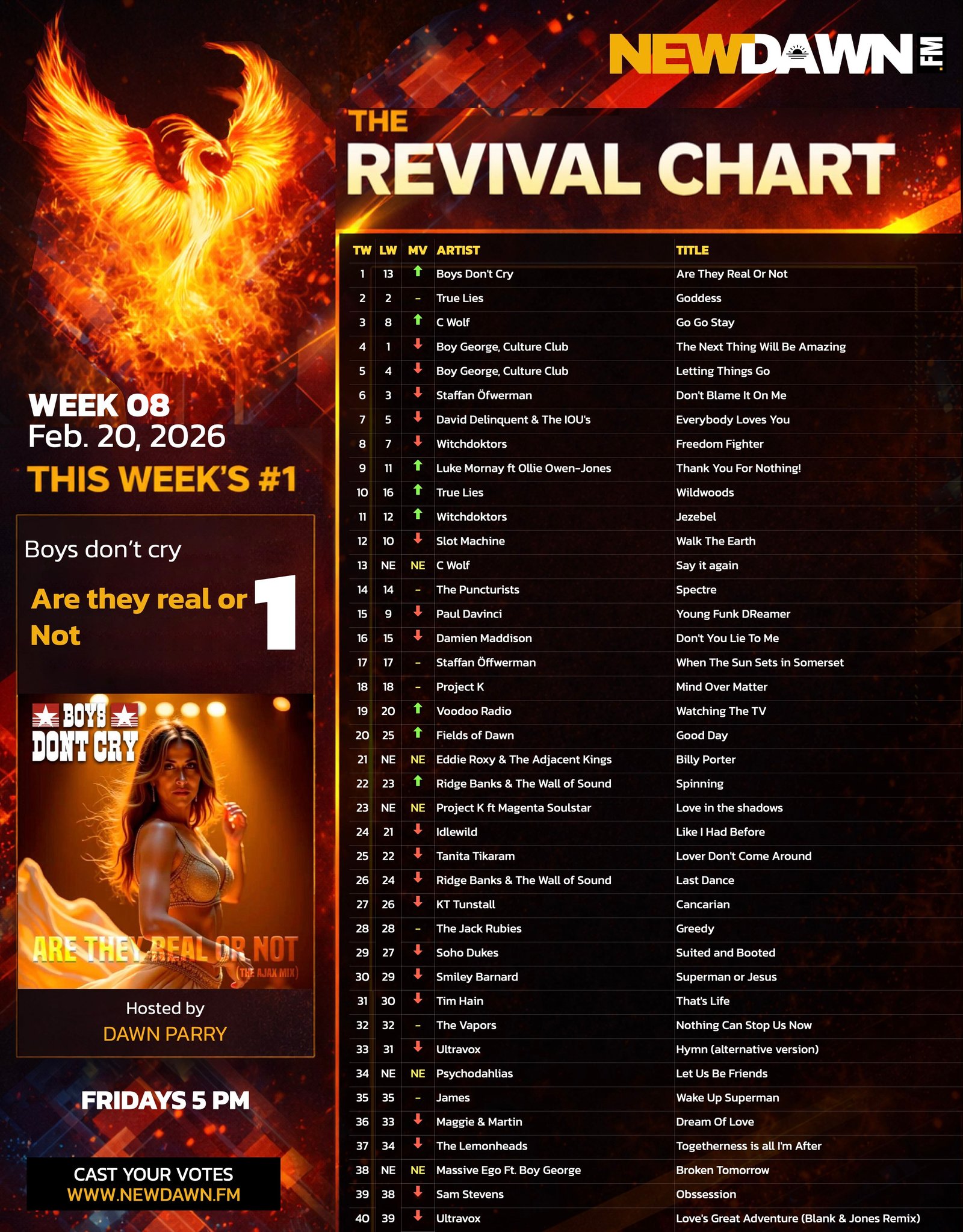 WELCOME TO THE OFFICIAL NEW DAWN RADIO TOP 40 REVIVAL CHART! Discover the ultimate platform for your favourite seasoned artists in the music industry with The Revival Chart. At New Dawn Radio, we celebrate those with over 20 years of releasing music and who continue to create fresh, exciting NEW music, even if mainstream radio often exclude them. How It Works: •Eligibility: Artists qualify if they or their band member/s have 20 years since their first song release under their belt. Their songs will debut on Dawn Parry’s daily Breakfast Show and on the Red Carpet Show 4pm, the hour before the Revival Chart Show every Sunday 5pm UK time. •Voting: Tracks with the most airplay over 7 days enter the Hot 50 Voting Pool. You then vote for your favourite songs/artists each week via the New Dawn Radio website. Listeners can vote for as many artists/songs as they like, but they can only vote only once per week. The votes are counted up each Friday, resulting in the Revival Chart positions. •Chart Updates: New releases have 4 weeks to hit the Top 40, or they’re removed from the pool. Every Sunday at 5 PM UK time, the Top 40 is unveiled on the Official Revival Chart Show on NewDawn.FM. Want to preview the tracks? Explore our curated playlist on Spotify for a taster of the best in the very latest new Revival music from your favourite Revival artists.